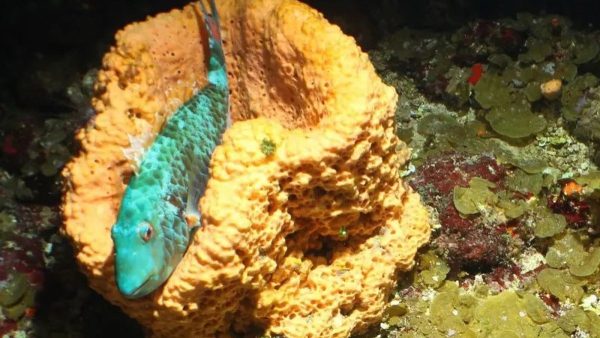 A equipe filmou peixes se movendo entre corais gorgônia e esponjas-marinhas gelatinosas alaranjadas, perto de corais pretos.