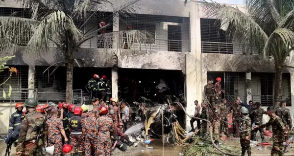 Segundo o jornal local "Prothom Alo", o avião teria caído sobre o telhado do refeitório da faculdade. Vídeos do momento após a queda mostram um grande incêndio próximo a um gramado, com uma densa coluna de fumaça subindo no céu, enquanto multidões observavam de longe. Imagens do local mostraram equipes de resgate combatendo as chamas e retirando as vítimas de dentro do prédio.