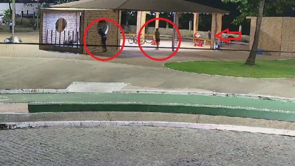 As imagens (veja abaixo) mostram dois suspeitos armados (circulados em vermelho na foto acima). Eles se aproximam do espaço onde entregadores de delivery costumam descansar e atiram contra eles. É possível perceber bicicletas e mochilas ao redor.