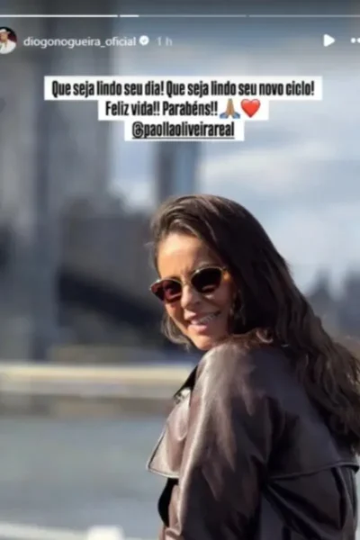A atriz Paolla Oliveira completou 44 anos nesta terça-feira (14) e foi homenageada pelo ex-namorado, o cantor Diogo Nogueira. Em publicação nas redes sociais, o artista postou uma foto da atriz sorridente e desejou votos de felicidade para ela.