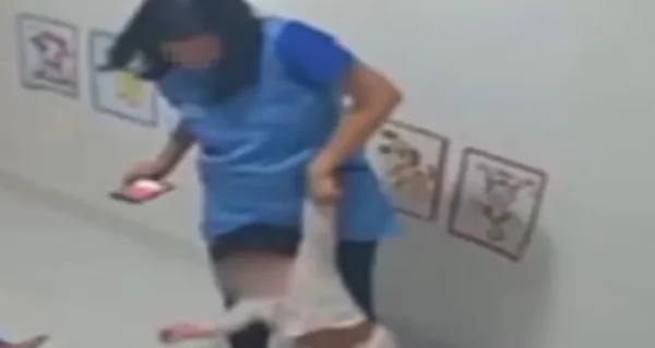 As imagens mostram o momento em que a mulher pega a criança pelo braço, supostamente após se incomodar com o choro da menina. Ela segura bruscamente a aluna, a coloca para fora da sala, fecha a porta e começa a mexer no celular.