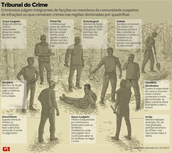 Os tribunais ilegais ou do crime, como são chamados na crônica policial, têm quase a mesma dinâmica de um julgamento comum, com "réu", "acusador", "vítima" e "julgadores".