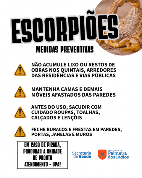 A SMS orienta que, em casos de picadas, procurar imediatamente a Unidade de Pronto Atendimento (UPA) do município, com atenção redobrada para crianças e idosos.