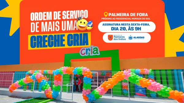 O município de Palmeira dos Índios dará mais um passo importante no fortalecimento da educação infantil. Nesta sexta-feira (20), às 9h, o governador Paulo Dantas autorizará a construção de mais uma unidade do programa Creche Cria no município. A assinatura da Ordem de Serviço acontecerá nas proximidades do Residencial Morada do Sol, na comunidade de Palmeira de Fora.