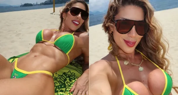 Campeã do Power Couple 3 e musa da escola de samba Grande Rio, ela posou com o modelito verde e amarelo na praia, e foi amplamente elogiada nas redes sociais ao posatar as fotos do ensaio.