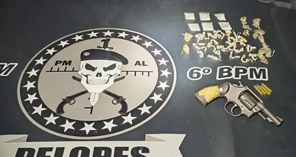 Durante a revista, foi encontrado na cintura dele um revólver calibre .38 municiado, além de uma pochete com drogas. O material apreendido soma 13 gramas de maconha, 12 gramas de cocaína e 22 gramas de crack, além de quatro munições intactas.