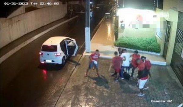 No vídeo, a vítima aparece sendo agredida por dois torcedores do CRB e outros seis homens surgem em seguida, após um carro parar no local.