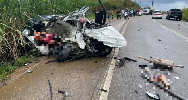 Imagens feitas no local mostram a violência do impacto. O carro de passeio, de cor branca, ficou completamente destruído, com partes metálicas retorcidas e componentes do motor espalhados pelo asfalto.