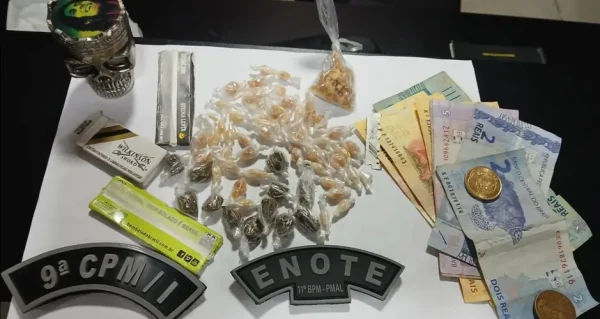 Com os suspeitos, os policiais encontraram 12 bombinhas de maconha, 50 pedras de crack, dinheiro em espécie, além de lâminas e um dichavador — objetos comumente utilizados no preparo e fracionamento de entorpecentes.