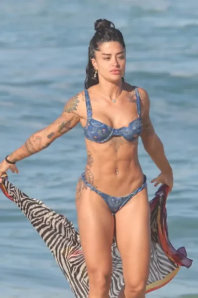 Aline Campos, de 37 anos de idade, tem aproveitado as manhãs ensolaradas no Rio de Janeiro após uma sequência de dias nublados. A atriz foi fotografada, nesta quarta-feira (4), na Praia da Barra da Tijuca enquanto dava um mergulho no mar, exibindo a silhueta definida num biquíni azul estampado.