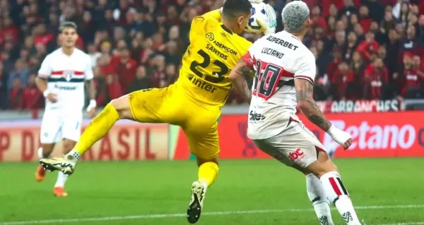 Acuado, o São Paulo mal passava do meio de campo e só teve oportunidade nos acréscimos. Jandrei fez lançamento longo, Esquivel falhou ao tirar, e Ferraresi foi travado por Santos na hora de finalizar.