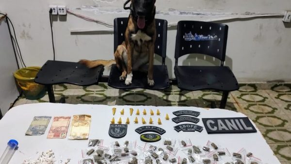 Durante a revista pessoal, a polícia encontrou R$ 62 em espécie. Já dentro sacola, uma quantidade de drogas foi recolhida. Depois, o homem admitiu que havia escondido uma outra parte dos entorpecentes em um terreno baldio. Os policiais se deslocaram para o endereço indicado e a cadela farejadora K9 Luna encontrou duas bolsas com drogas.