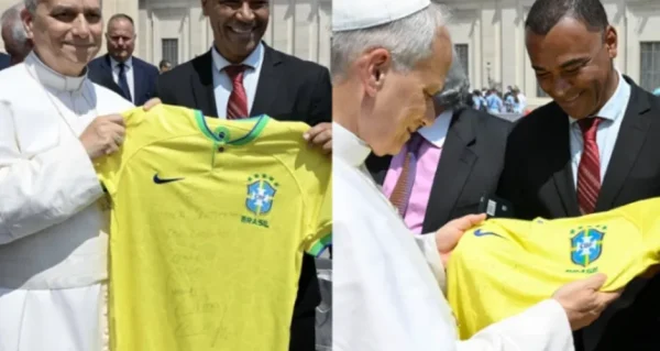 O Papa Leão XIV recebeu, nesta quarta-feira (11/6), uma camiseta da Seleção Brasileira do ex-jogador Cafu, capitão do penta e bicampeão do mundo pela Canarinho. O item foi autografado pelo icônico lateral da Amarelinha e veio acompanhado de uma dedicatória.