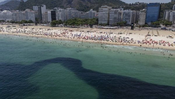 O movimento de um cardume formou uma longa mancha escura no mar de Copacabana e do Leme, no Rio de Janeiro, nesta sexta-feira (26).