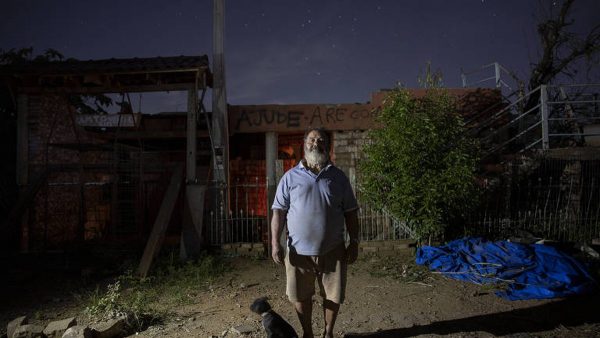 Em meio ao que restou da sua casa, o aposentado João da Silva, 66, toma chimarrão enquanto escuta música em um rádio de pilha à noite.