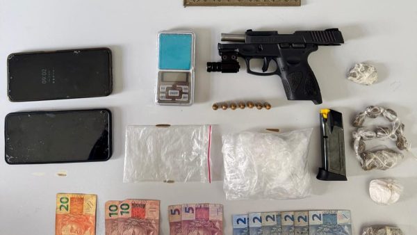Ao chegarem à AL-225, os policiais abordaram a van e realizaram buscas nos suspeitos. Um jovem, de 21 anos, portava uma pistola 9mm com sete munições intactas, enquanto um menos, de 16 anos, carregava 16 gramas de cocaína, 68 gramas de maconha prensada, uma balança de precisão, dois celulares e R$ 62 em espécie.