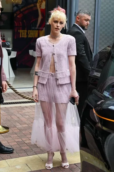 Kristen surgiu com um conjunto de short e casaquinho rosa-bebê com uma saia transparente em tule por cima -- com parte da barriga também aparecendo -- para a divulgação do filme "The Chronology of Water", seu primeiro trabalho como diretora. Detalhe: as pontas dos cabelos da atriz e diretora também estavam pintados de cor-de-rosa.
