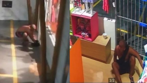 Em imagens enviadas ao TNH1, o homem aparece sentando na porta do estabelecimento, colocando um papelão e um cone na frente para disfarçar enquanto quebrava os cadeados. Em seguida, o suspeito de furto consegue fazer uma pequena abertura e se arrasta para dentro da loja