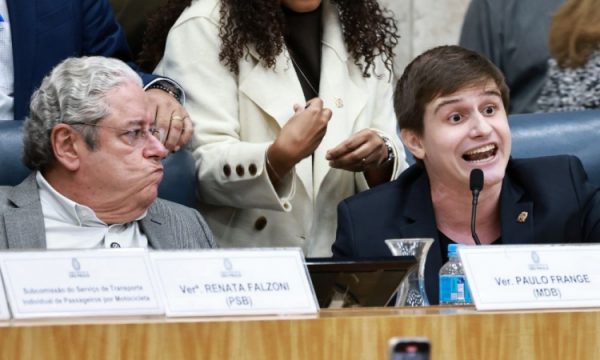 O vereador Lucas Pavanato (PL) e o presidente do sindicato dos motoboys de São Paulo, Gilberto Almeida dos Santos, se envolveram em uma briga na tarde desta quinta-feira (29) na Câmara Municipal. O entrevero ocorreu durante audiência pública para discutir a regularização do serviço de mototáxi na capital paulista. “Serei breve. Só para parabenizar o prefeito, ele conseguiu a proeza de escolher o sindicalista pelego mais rejeitado pela categoria que ele diz representar na história. Realmente, uma piada”, disse o vereador, que foi repreendido pela colega Renata Falzoni (PSB), que coordena os trabalhos. “Gil dos Motoboys”, como é conhecido o sindicalista, se dirigiu até a tribuna e pegou o vereador pela camisa, momento em que assessores e a segurança da Câmara interviram para separar ambos.