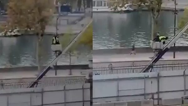 No vídeo, eles aparecem descendo pela plataforma de elevação montada em uma caminhonete, logo depois de arrombarem duas vitrines da Galeria de Apolo e levarem nove joias. A cena parece ter sido filmada por um visitante do Louvre, de uma das janelas de uma ala próxima.