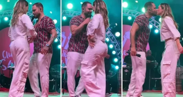 Em perfeita harmonia, os dois dançaram juntinhos no embalo do clássico "Maneiras", de Zeca Pagodinho, e selaram a participação para lá de especial da intérprete da Heleninha, de Vale Tudo, com um beijão. O público foi ao delírio e aplaudiu de pé a performance do casal.