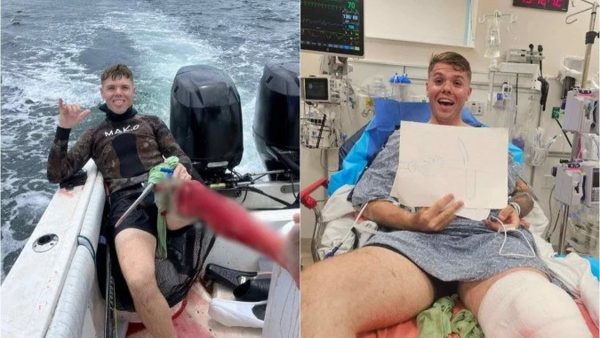 Ele também contou que assim que chegou à superfície da água foi ajudado por amigos para subir de volta para o barco. “Conseguimos fazer um torniquete improvisado com uma camiseta, uma faixa de arpão e uma faca de filé”, disse Chance.
