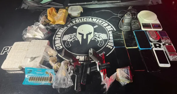 No interior do imóvel, os militares encontraram uma grande quantidade de entorpecentes e armamentos. Foram apreendidos 788 gramas de maconha, 43 gramas de crack, 2,638 kg de cocaína, quatro balanças de precisão, um rádio comunicador com duas bases carregadoras, sete celulares, uma pistola calibre .380, um revólver calibre .38 e diversas munições de calibres .38 e .40.