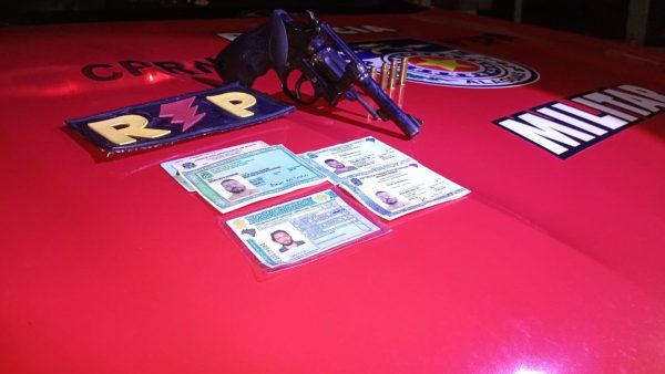 A vítima relatou à Polícia Militar que foi ameaçada e agredida pelo homem, que foi localizado dentro de um carro. No automóvel foram apreendidos um revólver com quatro munições, documentos falsificados com a foto do agressor e originais de terceiros e duas bombinhas de cocaína.