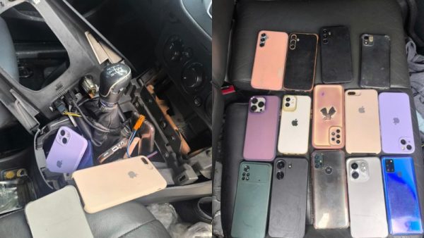Os aparelhos estavam escondidos próximo à caixa de marcha do veículo; assista ao vídeo do momento em que os celulares são identificados e retirados do local pelos agentes.