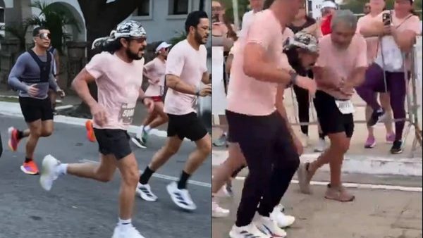 Em vídeo que circula nas redes sociais, é possível ver o artista sendo auxiliado por dois homens até a linha de chegada, completando a prova quase que se arrastando.